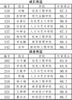 经过前期各二级学院院赛或直接推荐的方式,共收集67名选手的参赛作品,其中成长赛道45人,就业赛道22人,经过外审专家网络评审后,共选出成长赛道8人,就业赛道8人参加校赛,现将参赛选手名单公示如下: