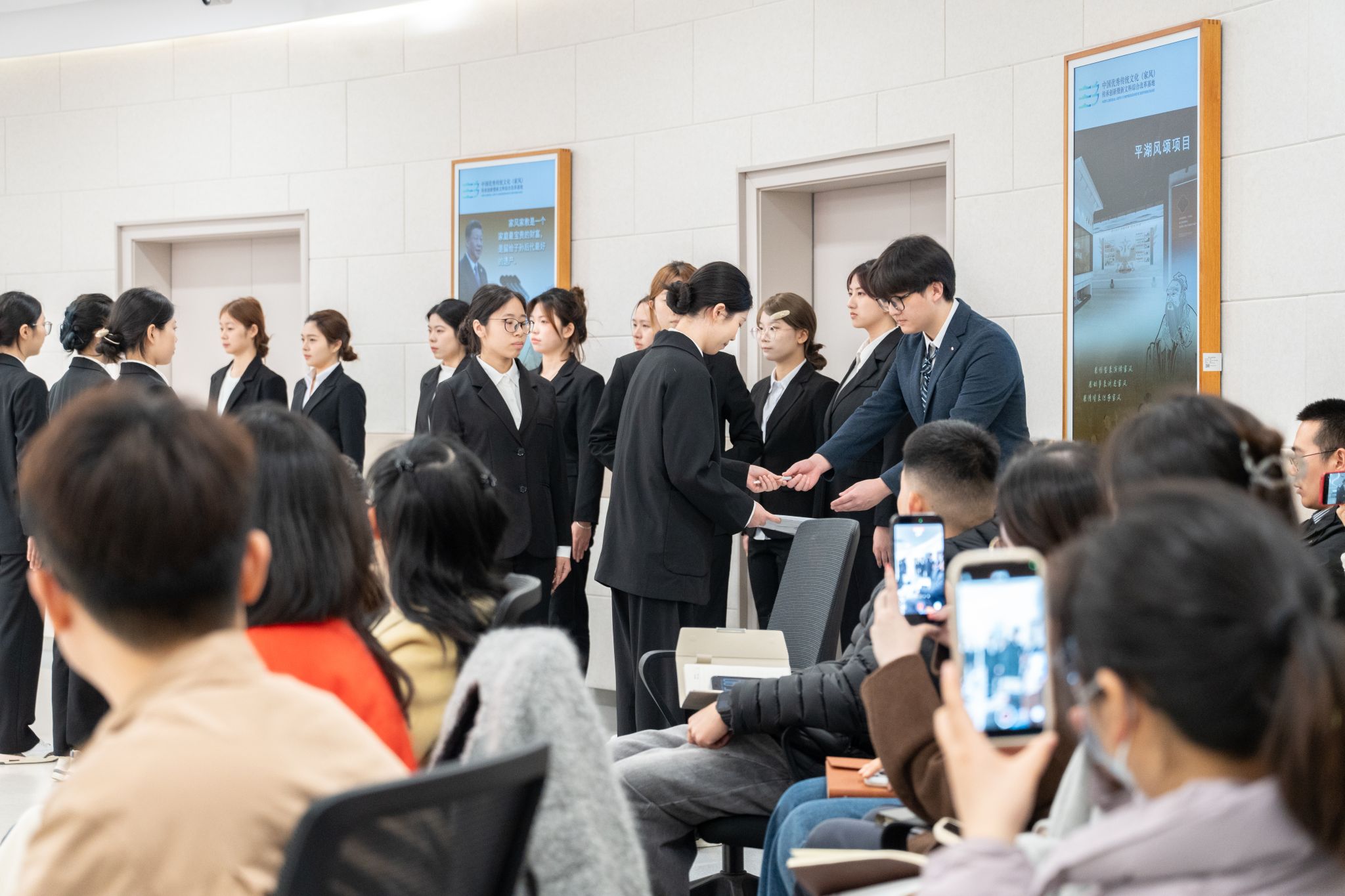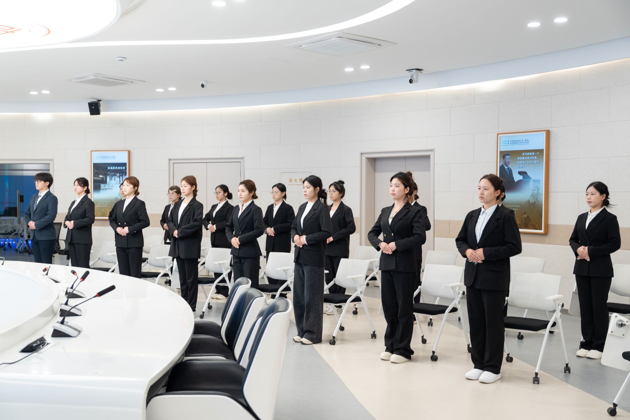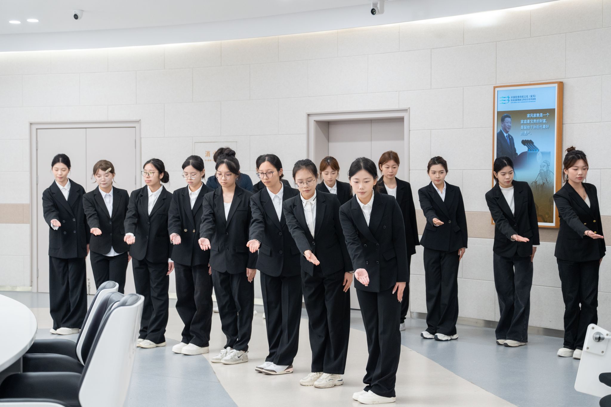 备课会上,史晓婧老师围绕仪容仪表、职场穿搭、行为举止礼仪等内容进行细致讲解,结合具体案例,系统阐释了求职场景中礼仪规范的教学要点与方法创新。秘书学专业20名同学现场展示了礼仪操及入场、交谈、致意等场景的礼仪动作,通过形象化、标准化的演示,生动呈现了教学成果与实践转化的有机融合。
